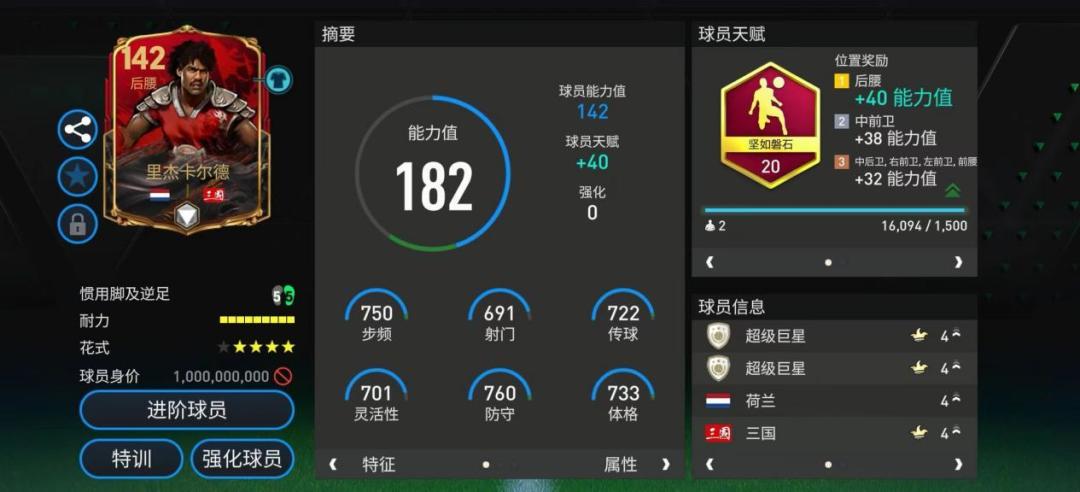 里杰卡尔德是足坛知名组合“荷兰三剑客”中,最勤恳的那个。在场上,他不仅能完成自己本职的防守工作,还能适时参与进攻,利用精湛的远射和稳定的持球给对手施加压迫。今天我们就来看看三国活动中推出的这张里杰卡尔德。 本次三国活动中,里杰卡尔德同样是推出了三张不同能力值的球员卡,玩家可以通过章节活动以及商城卡包获取。位置上,里杰卡尔德依旧是后腰,这也是他在游戏中历代版本,最常见的一个位置。 面板数据 天赋