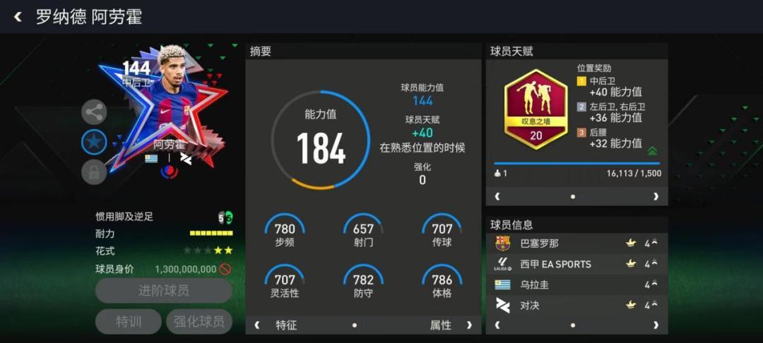 阿根廷队在小组赛中三战全胜,以傲人之姿进入美洲杯四分之一决赛,在与厄瓜多尔队的较量中,阿根廷通过角球战术率先破门,后被厄瓜多尔顽强绝平。在点球大战中凭借大马丁的神勇发挥跻身进入美洲杯半决赛。本期巨星来袭就为大家推荐一位获胜功臣——罗梅罗。 数据&特性 数据方面,24美洲杯甄选罗梅罗的基础能力值给到了141,配备叹息之墙天赋,他的双速给到了657,作为中后卫的他防守和体格是罗梅罗的最大优势,卡面数据