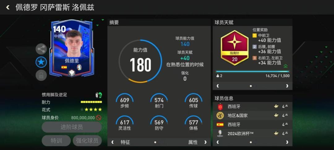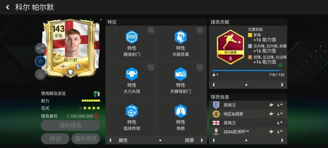 作为2023-24赛季的切尔西队内最佳球员,帕尔默在本届欧洲杯获得了英格兰主帅索斯盖特的征召,他将在这支人才济济的三狮军团与福登、萨卡等队友竞争首发位置。尽管首战塞尔维亚的比赛,帕尔默没能获得出场机会,但相信随着赛事的进行,他一定能在欧洲杯舞台上展现自己的天赋。 特性方面,帕尔默配备了八项特性,反越位大师增强了他的跑位意识;精准射门、外脚背射门让他的射术更加精湛;大力头球让帕尔默的高空球终结能力显