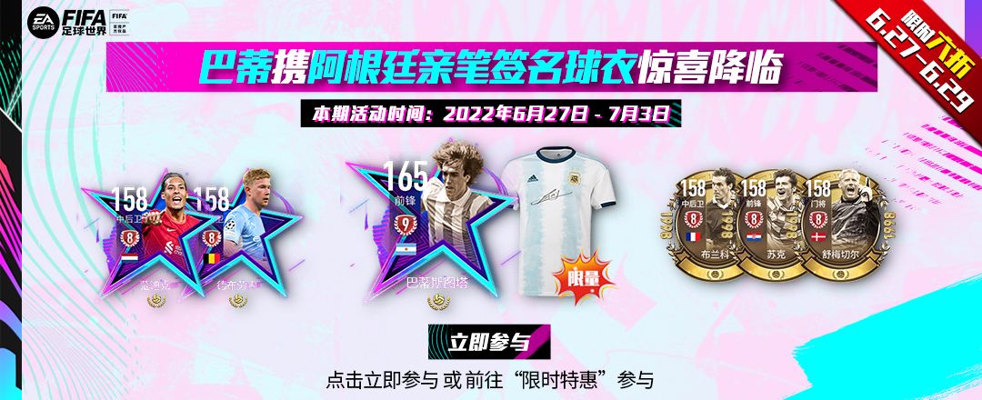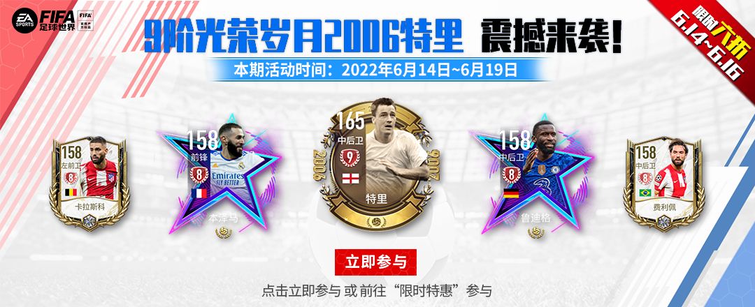 FIFA足球世界好礼永不停歇,本期射门全新换装,同时也更新传奇和卡王奖池、兑换商店奖励,高阶球员登陆射门,更有10亿转会费等你领! 本期活动时间:2022年6月14日~6月19日 6月14日~6月16日,限时六折! 活动地址:前往游戏内“限时特惠”按钮进入或 >点击立即参与< 活动玩法介绍: 1. 传奇奖池可使用游戏币进行射门,可选择20个/一次和96个/五次; 传奇奖池里有海量经验、金币、突破材