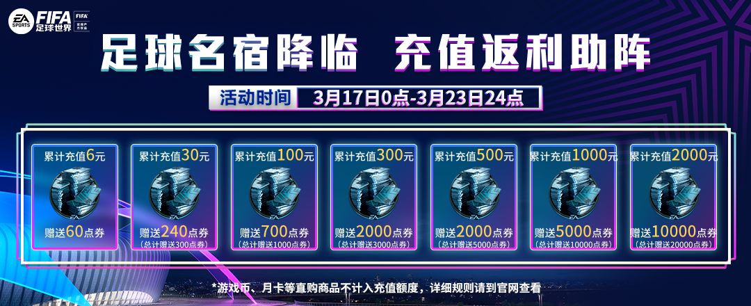 亲爱的玩家, 随着足球名宿活动的开启,我们也为各位球星准备了超值充值返利。3月17日至3月23日期间,累计充值达到一定金额,最高可获得2万点券返利,具体规则如下: 活动时间: 3月17日00:00 – 3月23日23:59(额外赠送的点券将在充值达到指定额度后立即到账) 累计充值6元,额外送60点券(总计送60点券) 累计充值30元,再返利240点券(总计送300点券) 累计充值100元,再返利7