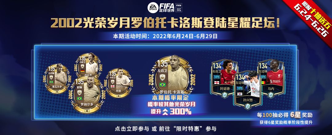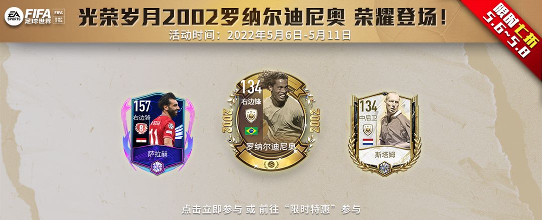 光荣岁月2002罗纳尔迪尼奥 荣耀登场! 《FIFA足球世界》本期荣耀金杯更新!强力热门球员已加入金杯奖励中,现在参与活动赢取光荣岁月球员以及海量游戏强化道具,赶快行动起来吧! 活动时间:2022年5月6日~5月11日 5月6日~5月8日,限时七折 活动地址:前往游戏内“限时特惠”按钮进入或 >点击立即参与< 活动玩法介绍: 一、荣耀金杯奖池 1、荣耀金杯活动分为16强/8强/4强/终结对决四个阶