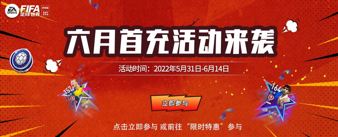 亲爱的玩家,《FIFA足球世界》首充活动来啦!玩家在活动时间内进行充值即可解锁相应奖励,本月首充更新了月首充和历史首充的奖励,多名高阶球员和海量转会费、强化和转移材料静候您的领取。(历史免费玩家充值可以前往本次活动的“历史首充”版块进行奖励解锁)。 活动时间:2022年5月31日~6月14日,领奖时间截止至15日。 活动地址:前往游戏界面“限时特惠”或 >点击立即参与< 活动规则: 一、本月首充回