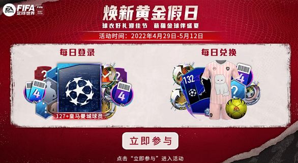 亲爱的《FIFA足球世界》玩家朋友们,精彩的四月进入尾声,黄金周小长假即将来袭,《FIFA足球世界游戏》也为大家准备了丰富多彩的假期活动,海量福利助你欢度小长假! 活动一:换新黄金假日 活动时间:4月29日-5月12日 活动地址:扫描下方二维码或在游戏内活动中心处进入 每日登陆 玩家在指定日期登陆游戏即可到活动界面领取对应的奖励,奖励中不仅有强化材料、欧冠活动代币等游戏资源奖励,更有127+皇马曼