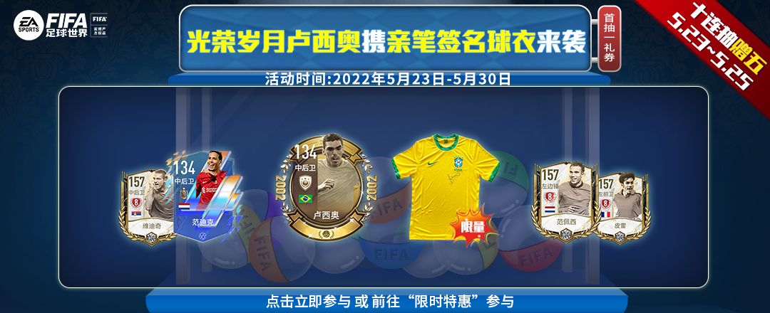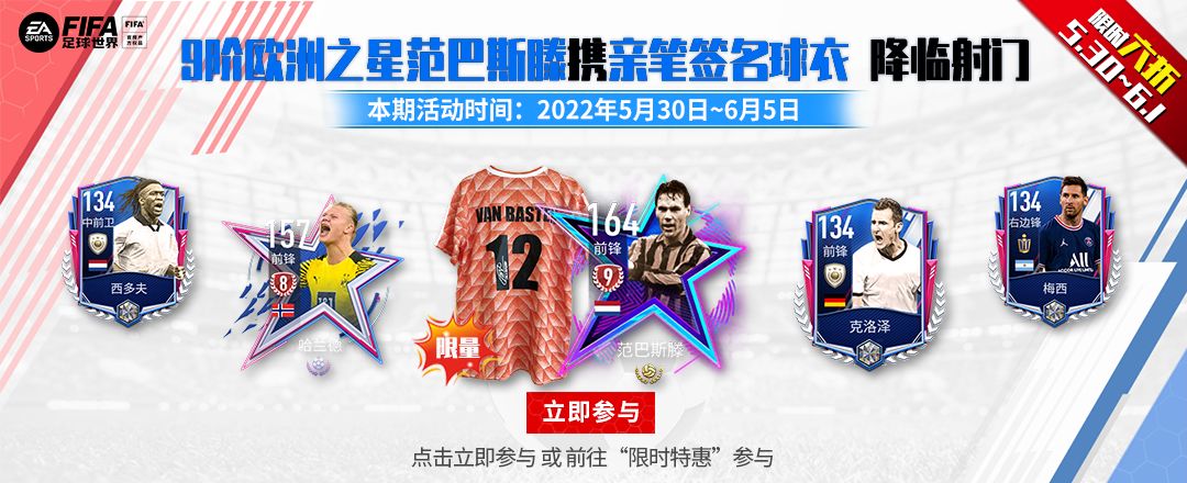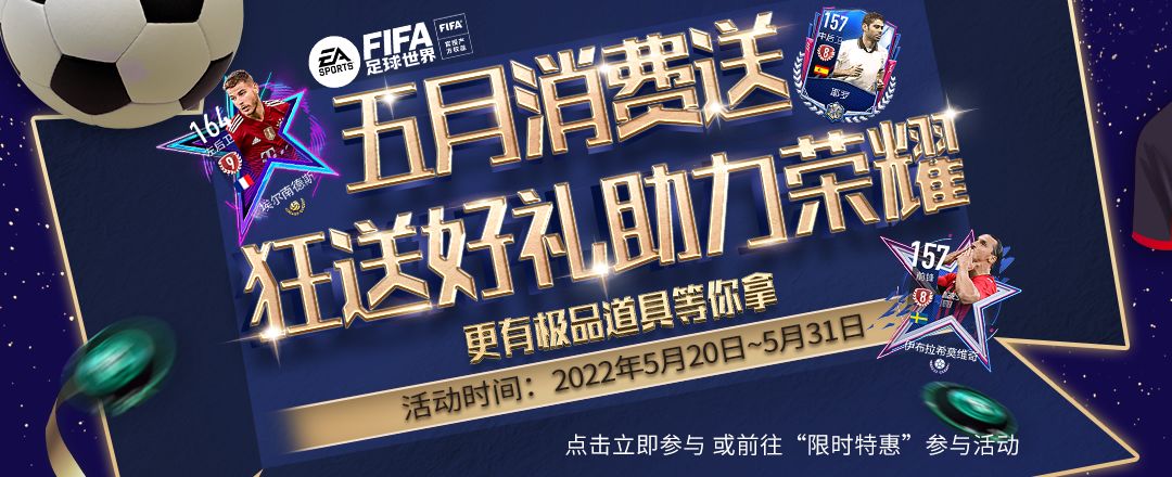 FIFA足球世界好礼永不停歇,本期射门全新换装,同时也更新传奇和卡王奖池、兑换商店奖励,高阶球员登陆射门,更有10亿转会费等你领! 本期活动时间:2022年5月30日~6月5日 5月30日~6月1日,限时六折! 活动地址:前往游戏内“限时特惠”按钮进入或 >点击立即参与< 活动玩法介绍: 1. 传奇奖池可使用游戏币进行射门,可选择20个/一次和96个/五次; 传奇奖池里有海量经验、金币、突破材料、