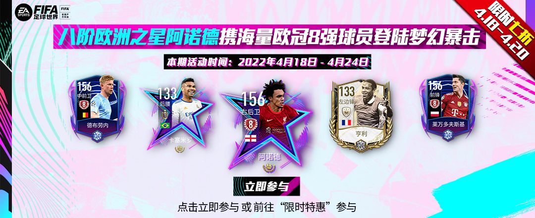 FIFA足球世界好礼永不停歇,闪耀欧陆更新啦!现在参与活动可获得球员包、海量天赋以及强化道具,更有强力球员等你来领,快快参与起来吧! 活动时间:2022年4月2日~4月11日 活动地址:前往游戏内“限时特惠”按钮进入或 >点击立即参与< 活动玩法介绍: 1、玩家消耗游戏币可在页面进行奖励抽取,可获得海量游戏道具和欧冠球员外同时还有机会获得闪耀欧陆代币,使用闪耀欧陆代币可以兑换到强力球员。 2、