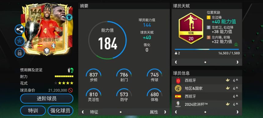 推荐球员 左边锋:尼克·威廉姆斯 尼克·威廉姆斯拥有顶级的边路进攻能力。他配备了猎鹰天赋,对自己的速度、盘带、传中等重要数据都有提升。马赛回旋结合四星花式星级也让尼克的持球进攻更具威胁。耐力值方面,9格的配置也让尼克能长时间保持稳定发挥。 实战中,尼克-威廉姆斯的速度优势明显。盘带方面,尼克的持球手感灵活,连续花式衔接流畅,近身对抗比较稳定。传球方面,尼克的边路45度区域传中弧度以及球速都很不错,
