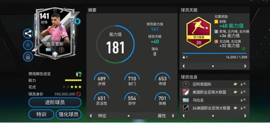 推荐球员 前锋:苏亚雷斯 美职联苏亚雷斯客串边锋表现出色,天赋方面,他配备了强力锋霸,对他的加速、射门、抢点、头球、力量五项数据都有一定提升。花式方面,三星花式星级的苏亚雷斯基础花式为马赛回旋,具备稳定的边路突破能力。 苏亚雷斯的本位是前锋,但是实战中出任右边锋也是足以胜任。虽然苏亚雷斯的身材不算高大,但是他的持球手感相当灵活,在盘带方面,苏亚雷斯的花式衔接速度以及控球稳定性俱佳,摇杆的调整也能让