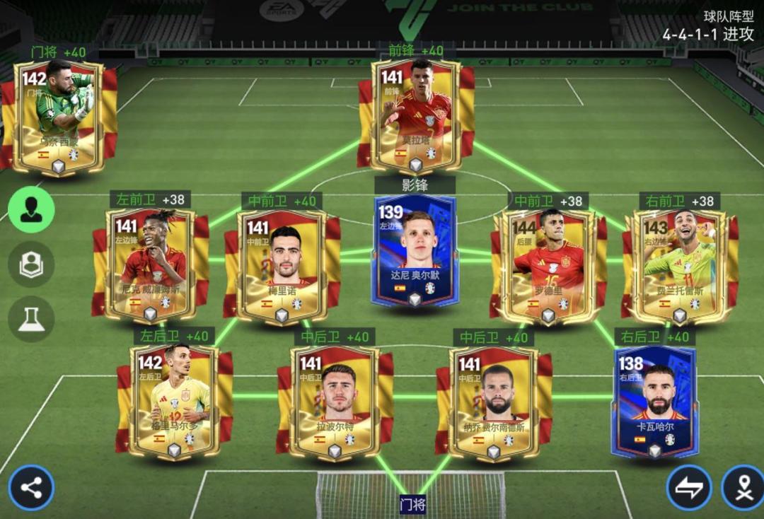 各位《FC足球世界》的玩家朋友们好,欧洲杯决赛即将打响,斗牛士和三狮军团谁将问鼎欧洲之巅,我们拭目以待!本期星聚欧洲杯,我们将在《FC足球世界》中复刻一下西班牙的战术打法,看看这支在欧洲杯中给广大球迷带来惊喜的西班牙队游戏中表现如何! 防守战术 阵型 4-4-1-1进攻 西班牙防守时,两个边锋都会回撤参与边路防守,与两个边后卫配合尽可能限制对方边路的进攻节奏。中路方面,奥尔莫的位置会靠前一些,
