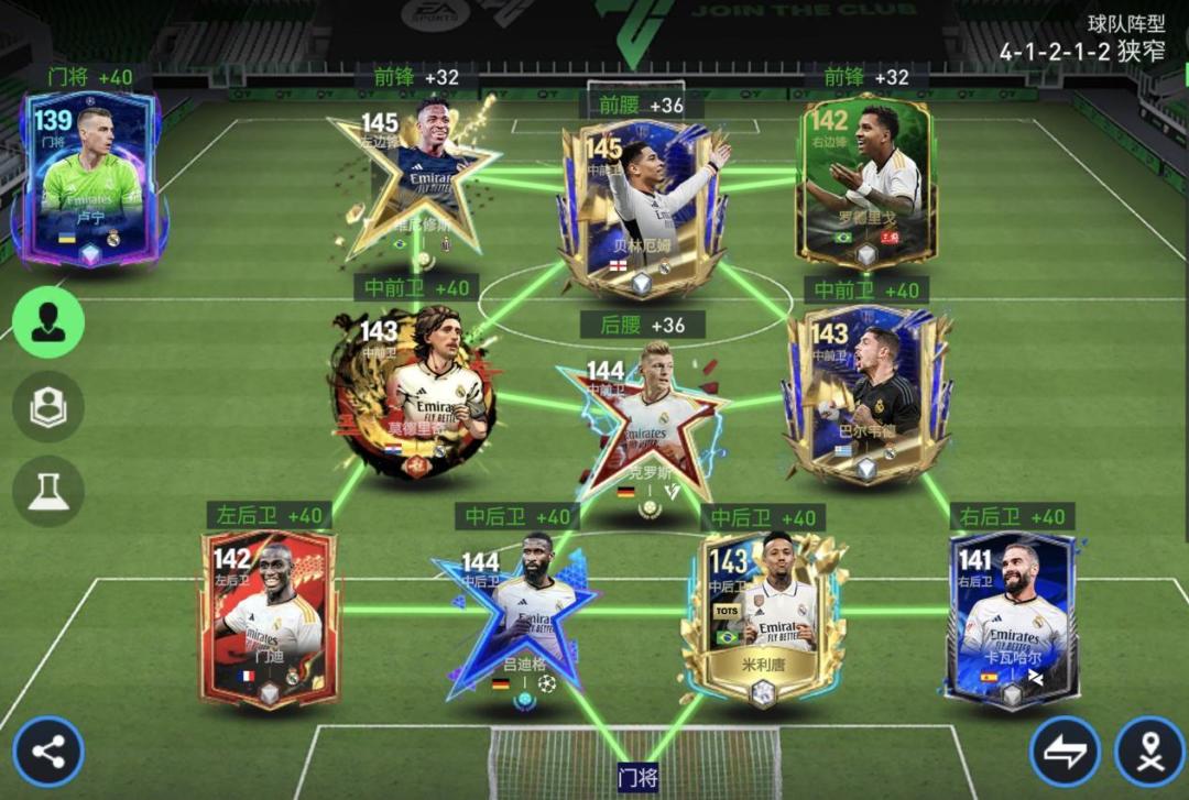 各位《FC足球世界》的玩家朋友们好,西甲联赛经历了一个赛季的比拼,最终皇家马德里众志成城,提前4轮夺得23-24赛季西甲联赛冠军,恭喜皇马!本期FC大师兄,我们推荐的队套就是这支新银河战舰,让我们看看在游戏中皇马队套是否同样所向披靡~ 阵容方面 首发阵容(4-1-2-1-2 狭窄) 首发: 前场:维尼修斯,罗德里戈 中场:莫德里奇,贝林厄姆,克罗斯,巴尔韦德 后场:门迪,吕迪格,米利唐,卡瓦哈