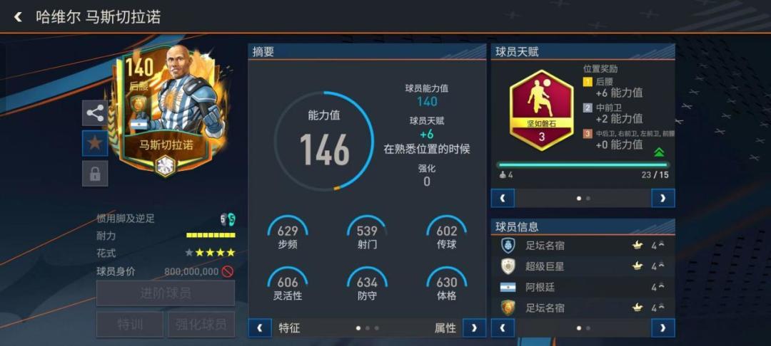 有一种坚强叫做流血不流泪,有一种品质叫做马斯切拉诺,不论他是在利物浦,在巴萨,在阿根廷国家队,还是在中超河北华夏,满场飞奔的马斯切拉诺都是后防线上那片不可或缺的拼图,他用咬钉嚼铁的意志,钢筋铁骨的身躯,给球队带来让人宽心的后防线。小马哥,一个拥有扎实基本功、广阔视野、大局观以及大心脏的优秀防守型球员。 数据&特性 数据方面,马斯切拉诺的基础能力值为140,配备坚如磐石赋,提升了冲刺速度、长传、人盯