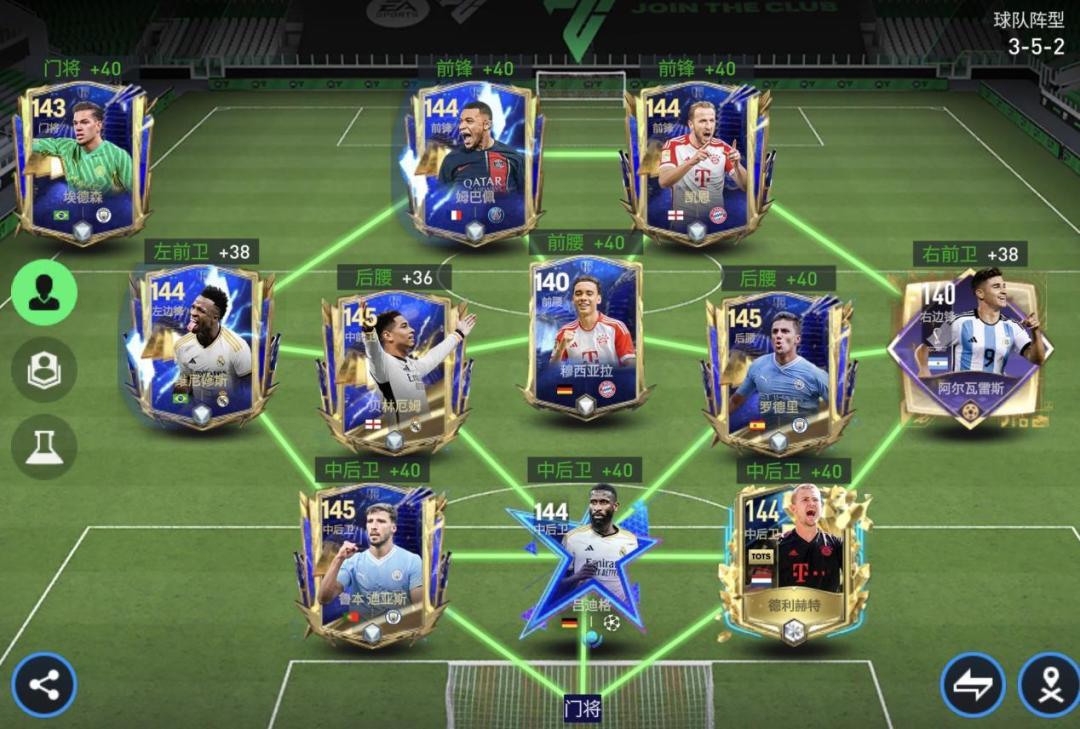 各位《FC足球世界》的玩家朋友们好,欧冠淘汰赛激战正酣!本期我们介绍的队套是由欧冠淘汰赛16进8次回合比赛中表现优秀的球员组成。欧冠赛场上大放异彩的球员门,在我们游戏中表现如何呢?我们一睹为快! 阵容方面 首发阵容(3-5-2) 首发: 前场:姆巴佩,凯恩 中场:维尼修斯,贝林厄姆,穆西亚拉,罗德里,阿尔瓦雷斯 后场:鲁本·迪亚斯,吕迪格,德利赫特 门将:埃德森 实战打法 进攻方式1(佯攻一路,大