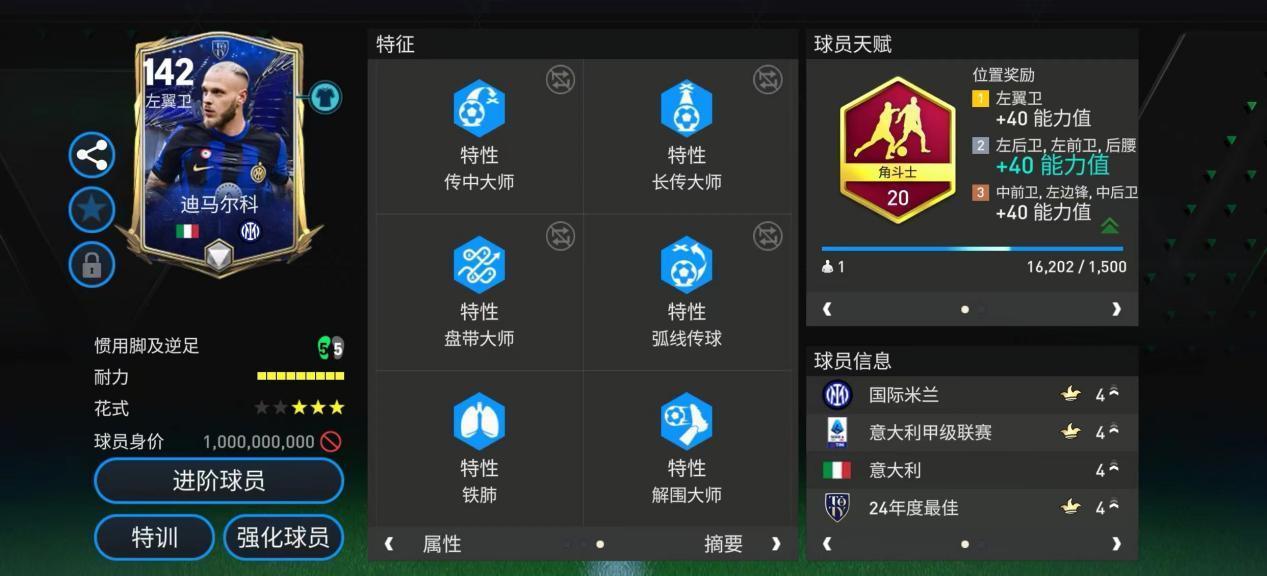 迪马尔科是意大利足坛目前最好的进攻型边后卫,在场上他攻守兼备,跑动积极,在边路的存在感非常高。迪马尔科的职业生涯出道于国际米兰青训,先后被租借至阿斯科利、恩波利锻炼,并在锡永、帕尔马有过履历。2021年12月,辗转多队的迪马尔科重回国际米兰,并与球队续约至2026年。 特性方面 特性方面,迪马尔科配备了铁人、铲球大师、传中大师、长传大师、盘带大师、弧线传球、铁肺、解围大师八项特性。这八项特性对