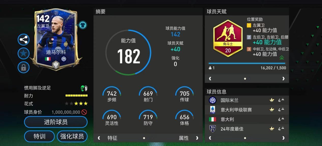 迪马尔科是意大利足坛目前最好的进攻型边后卫,在场上他攻守兼备,跑动积极,在边路的存在感非常高。迪马尔科的职业生涯出道于国际米兰青训,先后被租借至阿斯科利、恩波利锻炼,并在锡永、帕尔马有过履历。2021年12月,辗转多队的迪马尔科重回国际米兰,并与球队续约至2026年。 游戏中,迪马尔科是一名比较冷门的边后卫,年度最佳活动中,他凭借在过去一年的出色表现入围了年度最佳行列,在活动中他推出的这张基础能力