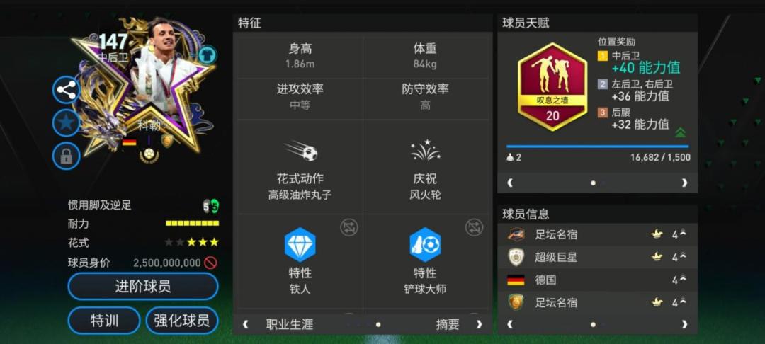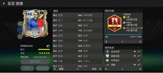 卡面介绍 天赋配置 亚亚图雷配备了叹息之墙天赋,天赋加强了他加速、人盯人、铲断、拦截、侵略性五项数据。加速数据的加成给了亚亚图雷极高的增益,他拥有着与模型极不匹配的超快移动,能够以极快的速度到达防守薄弱点强化防守。侵略性与铲断数据的提升也能帮助他在移动补防与回追防守中占据优势。 特性配置 亚亚图雷配备了八项特性,其中铲断大师、解围大师强化了他的防守表现,大力头球增强了他在禁区内的统治力,外脚背射门