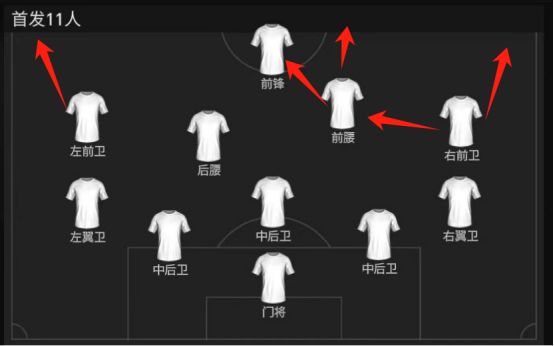 打法思路: 进攻端: 进攻时,在后场得球后,若选择短传推进,玩家可以使用边翼卫和后腰将球过渡给边前卫,边前卫与边翼卫在边路展开持续的压迫,迫使对手阵型结构发生改变。 在对手阵型结构变形之后,可以选择迅速传中给至禁区内落位的前锋终结;若前腰的位置更靠近肋部,也可以选择短传过渡给前腰,使他在中路与前锋继续配合操作。除此之外,若边前卫本身具备不错的内切终结能力,也可以选择其单兵突进完成最后一击。 防