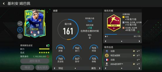 前锋:姆巴佩 游戏中,姆巴佩在欧洲杯活动中推出了一张基础能力值143的欧洲杯高光精选时刻球员卡。司职前锋的他配备了强力锋霸天赋,对自身的加速、射门、抢点、头球、力量五项数据有所提升。实战中,姆巴佩终结能力出色,且能作为持球点策动进攻。盘带方面,他在对手近身干扰时的控球保护稳定,花式衔接流畅并且小范围调整摆脱效率极高。得分方面,姆巴佩的搓射的弧度、准度俱佳,射门的聚力速度也非常快,能有效规避对手的
