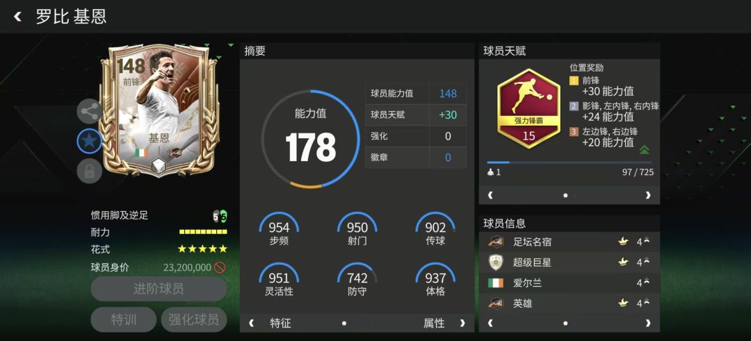 费迪南德 英超名人堂传奇中卫,费迪南德职业生涯长期效力于英超豪门曼联队,帮助曼联六夺英超冠军,并夺下一座欧冠冠军。他个人凭借出色的防守表现五次入选PFA年度最佳阵容,因其出众的脚下技术,他被一众英格兰媒体称为“新博比·摩尔”。 传奇圣殿费迪南德有着143的基础能力值,并配备了坚如磐石天赋与四星花式,他在现实中的脚下优势得到了还原。天赋对他体格数据的提升是显著的,他可以胜任更多的单防任务,实战价值与