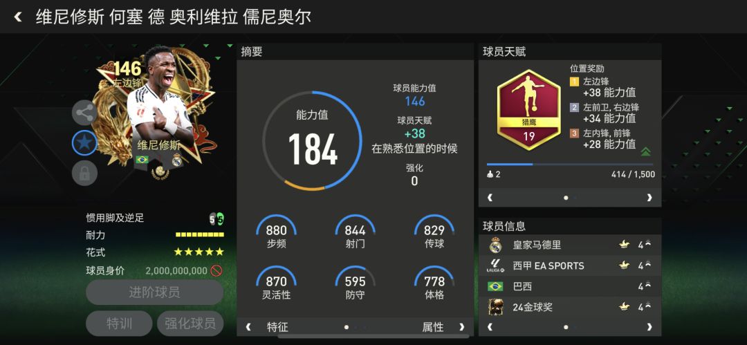 亲爱的玩家朋友们,本年度金球奖得主火热出炉,来自西班牙的曼城主力后腰罗德里获此殊荣,《FC足球世界》此前也上线了24金球奖活动。今天就让我们一起来关注一下24金球奖甄选球员中来自皇家马德里的热门球员吧! 维尼修斯 维尼修斯在2024年金球奖评选中排名第二,以41分之差惜败给罗德里。维尼修斯作为皇马的前场绝对核心帮助球队夺得了上赛季的欧冠冠军和西甲冠军。本次金球奖的失利会使维尼修斯愈战愈勇,发挥
