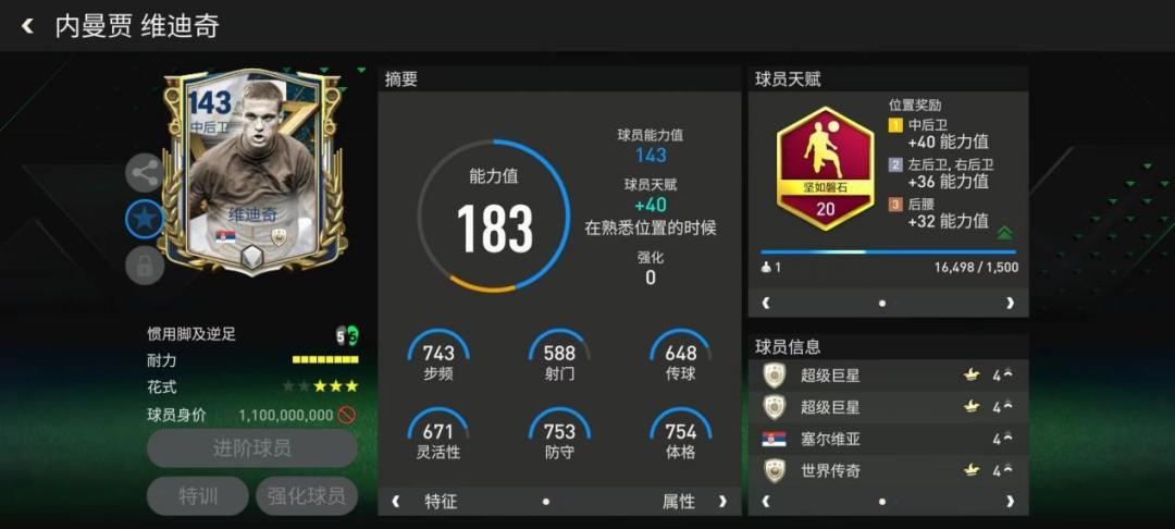 维迪奇 前塞尔维亚职业足球运动员,塞尔维亚足球巨星。职业生涯长期效力于英超豪门曼联队,曾与费迪南德共同组成让英超各大豪门闻风丧胆的黄金后卫组合。跟随曼联夺下过五次英超冠军与一次欧冠冠军,其铁血硬汉般的球风给球迷们留下了极为深刻的印象。曼联功勋主帅弗格森曾评价他“天生的英式中卫”。 传奇圣殿维迪奇同样给到了143的基础能力值,配备坚如磐石天赋,天赋加强了他的体格数据,他的对抗能力有了进一步的提升。从