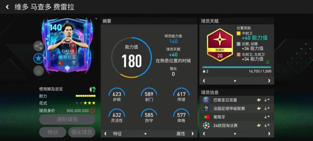 各位亲爱的《FC足球世界》玩家朋友们,伴随着2024欧冠总决赛的结束,本赛季的欧冠淘汰赛活动也正式步入尾声,欧冠活动的重头戏:欧冠最佳11人已经正式上线!本届欧冠最佳11人卡面采用了独特的流动色彩变化设计,搭配经典的“大耳朵”外形,整体卡面流光溢彩,赏心悦目,搭配队套之后战力也非常可观!下面一起来看一下欧冠最佳11人的队套搭配吧! 维蒂尼亚 中场位置上,这张维蒂尼亚给到了140的基础能力值,配