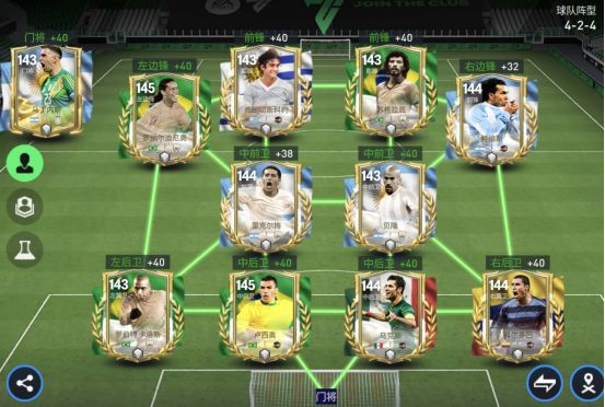 各位《FC足球世界》的玩家朋友们好,美洲球星素以球风华丽为大家所熟知,相信许多球迷是因为美洲巨星的球技而喜欢上足球。本期队套给大家带来的,便是本次美洲杯活动的传奇球星组成的队套,让我们来一起看看美洲球星们在我们游戏中的精彩表现吧! 阵容方面 首发阵容(4-2-4) 首发: 前场:罗纳尔迪尼奥,弗朗切斯科利,苏格拉底,特维斯 中场:里克尔梅,贝隆 后场:罗伯特·卡洛斯,卢西奥,马克斯,科尔多巴 门将