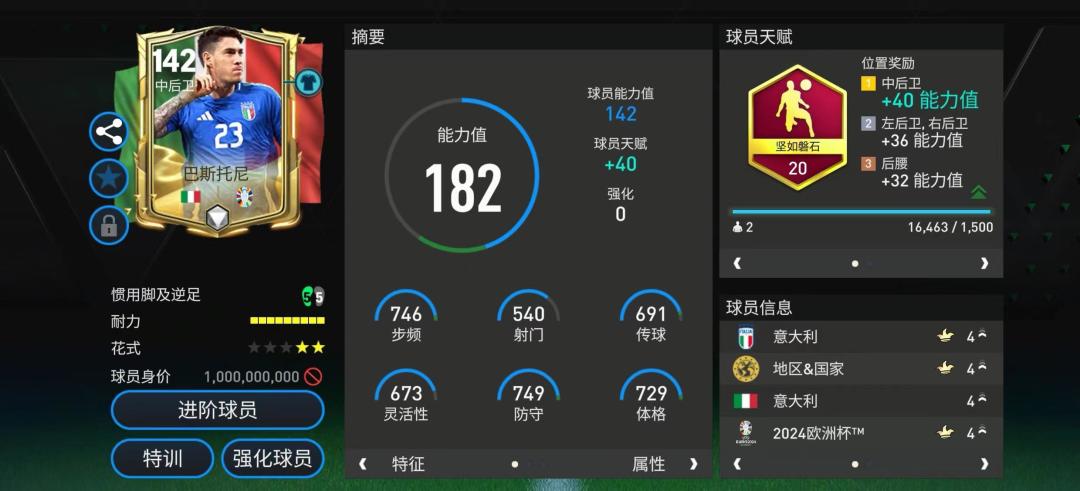 1999年出生的巴斯托尼如今已然是意大利、国际米兰的双料后防核心。上一届欧洲杯,他就随意大利最终问鼎冠军,本届欧洲杯赛场上,尽管作为卫冕冠军的意大利倒在淘汰赛首轮让人唏嘘,但是巴斯托尼的表现符合球迷的预期。而在俱乐部层面,巴斯托尼也已经帮助国际米兰夺得了两座意甲冠军在内的多项荣誉。 游戏中,巴斯托尼是一张比较热门的现役中后卫球员,在过去的各大活动中,他也推出过多张极具代表性的球员卡。本次欧洲杯活动