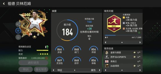 贝林厄姆 贝林厄姆在去年加盟皇家马德里后是球队当之无愧的关键先生,他多次终场前打入绝杀或绝平进球,帮助皇马在联赛和欧冠双线保持竞争力并夺得冠军。而在今年夏天的欧洲杯中,贝林厄姆也率领英格兰队取得了亚军的成绩,与冠军和金球奖失之交臂。年轻的贝林厄姆志在传承皇马的5号球衣,成为银河战舰的传奇人物。 在游戏中,本张24金球奖甄选球员贝林厄姆能力值达到了146,配备狙击手天赋,他的加速、射门、远射、抢点