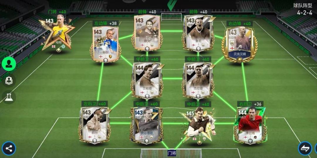 各位《FC足球世界》的玩家朋友们,贝克汉姆在我们游戏中一直都是备受欢迎的传奇球员之一。本期文章我们就来看看由143能力值的贝克汉姆等名将组成的英格兰传奇队套,实力如何! 阵容方面 首发阵容(4-2-4) 前场:科尔、欧文、鲁尼、贝克汉姆 中场:兰帕德、杰拉德 后场:阿什利·科尔、费迪南德、亚当斯、卡拉格 门将:哈特 实战打法-进攻 进攻方式1(边锋突破):424阵型在前场有着明显的人员优势