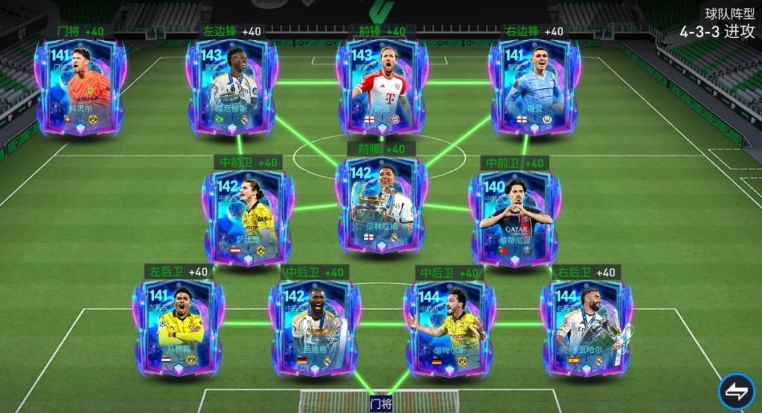各位亲爱的《FC足球世界》玩家朋友们,伴随着2024欧冠总决赛的结束,本赛季的欧冠淘汰赛活动也正式步入尾声,欧冠活动的重头戏:欧冠最佳11人已经正式上线!本届欧冠最佳11人卡面采用了独特的流动色彩变化设计,搭配经典的“大耳朵”外形,整体卡面流光溢彩,赏心悦目,搭配队套之后战力也非常可观!下面一起来看一下欧冠最佳11人的队套搭配吧! 阵型解析 (433—进攻) 首发阵容 前场:维尼修斯、凯恩、福