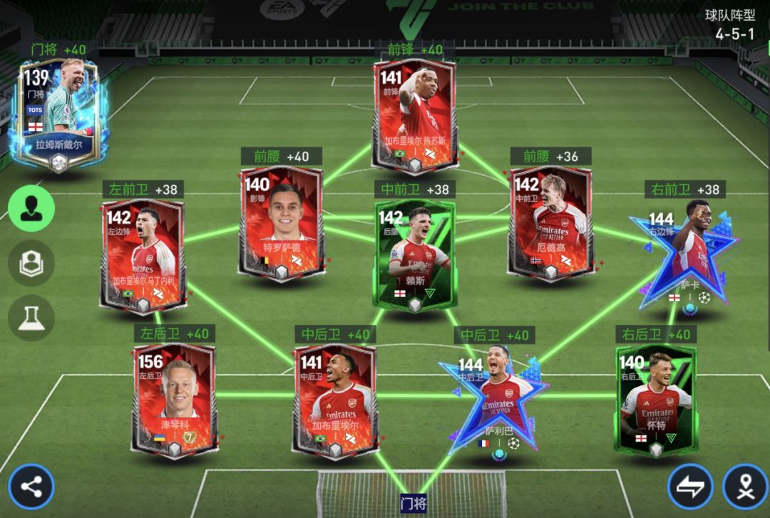 各位《FC足球世界》的玩家朋友们好,刚上线两周的对决活动受到了不少玩家的好评,其中北伦敦双雄阿森纳和热刺更是人气颇高。几个赛季以来,这支由年轻的“枪手们”组成的新一代“兵工厂”,让各位枪迷都眼前一亮。那么在我们游戏中,这支“青春风暴”表现究竟如何呢?今天就让我给大家介绍一下北伦敦德比阿森纳队套的玩法~ 阵容方面 首发阵容(4-5-1) 首发: 前场:特罗萨德,热苏斯,厄德高 中场:加布里埃尔·