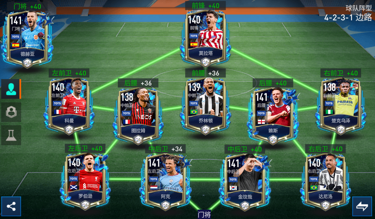 各位《FIFA足球世界》的玩家朋友们好,23赛季TOTS活动正在火热进行中,首先开启的是社区章节,许多本赛季发挥不俗的球员都入选了社区章节,他们在游戏中的强度也不错。那么将此次社区正选球员组成队套究竟有怎样的效果呢?今天就由我为大家带来社区正选球员队套的阵容讲解~ 阵容方面 首发阵容(4-2-3-1 边路) 首发: 前场:莫拉塔 中场:科曼,赫夫伦·图拉姆,乔林顿,赖斯,楚克乌泽 后场:罗伯逊,阿