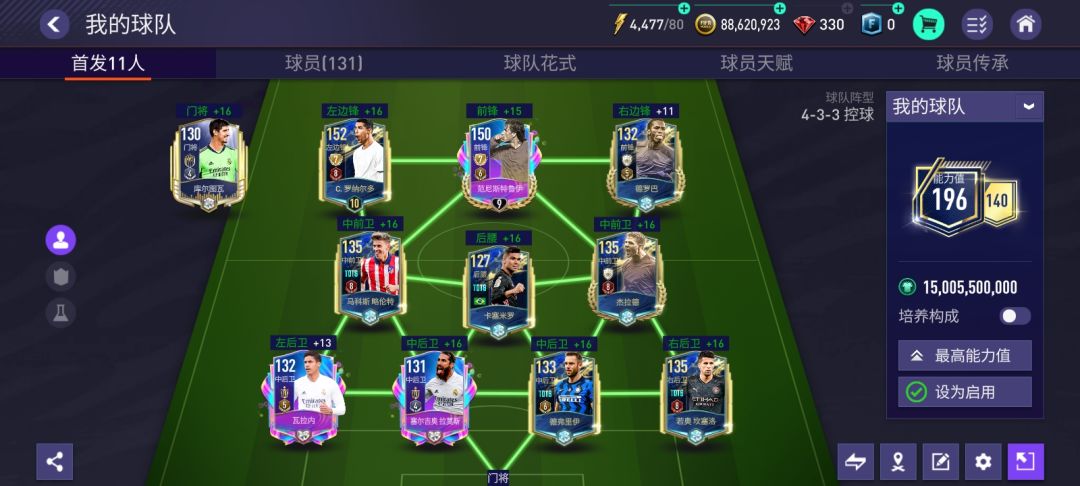 赛季最佳活动中,来自各大联赛的传奇球员持续登场,尽管还有多个联赛章节没有开启,但现有的传奇球员已经让F宝挑花了眼!本期文章,F宝就带兄弟们一起看看由赛季最佳传奇球员所组成的队套,在游戏中的实力如何! 阵容搭配 赛季最佳传奇球员强度不一,基础能力值区间为145-147,这里F宝根据高能力值球员的位置分布,选择了一套433防守系列阵型来进行讲解。 锋线:里贝里、戈麦斯、奥维兰 中场:马特乌斯、奥科查、