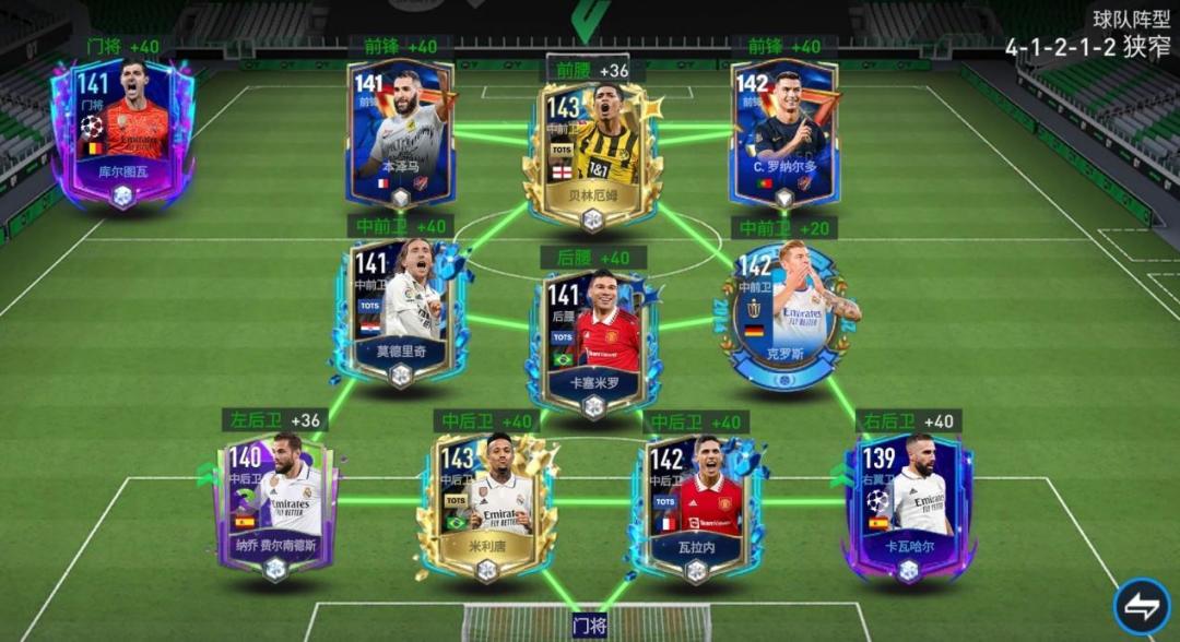 全新的引擎,全新的实战打法。进入新版本之后,由于实操环境与手感的变化,对于不同阵型的战术打法也要采取一定的调整。过往,在玩家们的眼中,41212狭窄阵型是相对较利于传中与肋部穿插战术的阵型,但在引擎更新后,这一阵型所适配的战术也发生了改变。今天就来为大家拆解一下在新世代中,41212狭窄阵型该怎么用出效果。 阵型范例 阵型搭配上,选取了比较有代表性的皇马新老两代强力球员搭配组成了这套阵型,在实