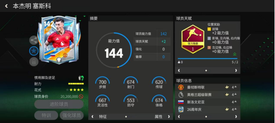 前锋:赛斯科 赛斯科,斯洛文尼亚前锋,曾效力萨尔茨堡红牛、RB莱比锡,2025年以8500万欧元加盟曼联。他兼具身体对抗与灵活跑位,门前终结能力强,头球与远射俱佳。新赛季为曼联贡献多粒进球与助攻,潜力十足。球员卡面配置球员天赋:强力锋霸(加速、射门、抢点、头球、力量)花式配置:扭身假射,四星级花式 耐力值:8格攻守效率:进攻中等、防守中等 特性数量:8铁人、反越位大师、精准射门、远