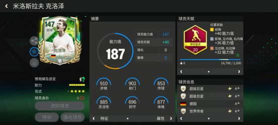 前锋:克洛泽 克洛泽的职业生涯始于德国地区联赛,在不莱梅崭露头角后,他以惊人的自律和勤奋逐渐成长为全能射手,并在拜仁慕尼黑达到生涯巅峰。国家队层面,他以16球的成绩位列世界杯历史第一射手,他那标志性的空翻庆祝也是一个时代的标志。 球员卡面配置球员天赋:禁区猛虎(射门、射门力量、抢点、盘带、力量)花式配置:马赛回旋,四星花式星级 耐力值:8格攻守效率:进攻高、防守中等特性数量:8铁人