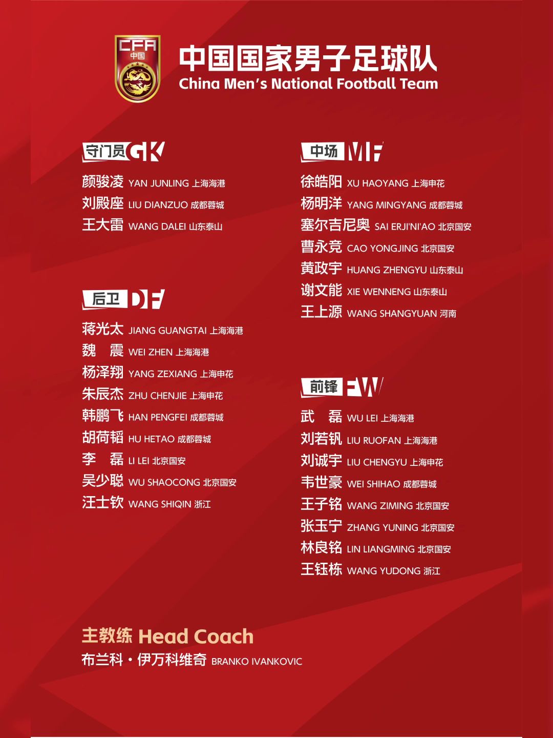 国足28人大名单公布!