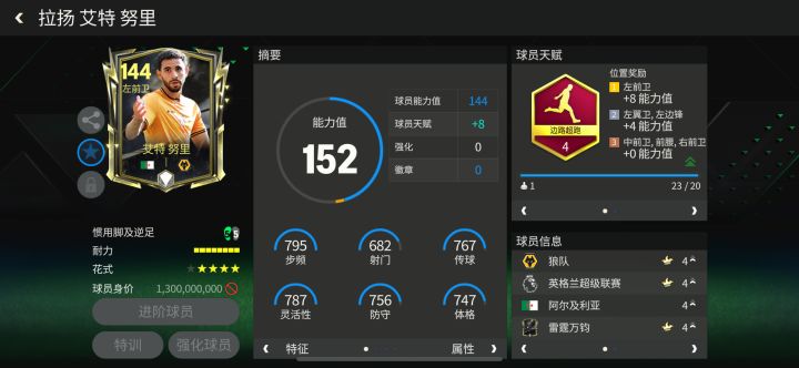 阿尔及利亚:努里努里在今年夏窗转会加盟曼城,他是埃尔及利亚的边路进攻核心之一。游戏中,雷霆万钧活动推出的努里司职左前卫,能力值达到144,天赋配备了边路超跑。实战中,努里在边路的冲击力极强,是一名进攻能力出色的边前卫。传球方面,努里前插之后的边路45度传中以及下底传中落点俱佳,搭配他极快的加速启动,能够在边路快速拉开空间。得分方面,努里内切搓**准,但是他在变向时的控球保护一般,爆射的跟进速度