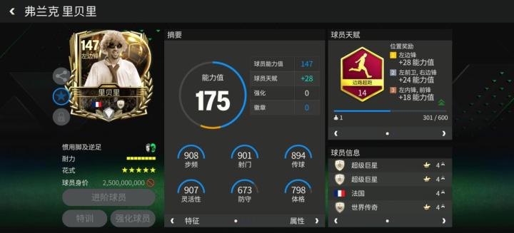 金球奖里贝里 游戏中,金球奖活动的里贝里配备了边路超跑天赋,对他的加速、冲刺速度、长传、传中、盘带五项数据提升显著。花式方面,高级油炸丸子搭配五星花式星级让里贝里的持球进攻表现更为出色,但8格的耐力值并不算高,里贝里无法长时间频繁做球队的持球核心。 实战中,里贝里的边路冲击力极强,内切得分表现稳定,是一位可靠的边路得分手。盘带方面,里贝里的花式幅度不大,擅长在小范围内进行连续调整摆脱,在边路冲