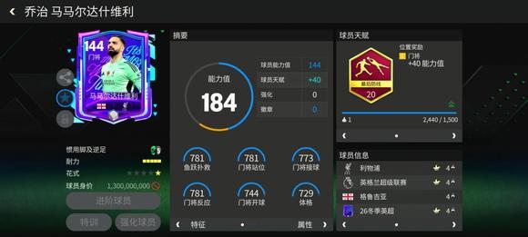 马马尔达什维利人才济济的格鲁吉亚男足近年来发挥抢眼。球队锋线上,最闪耀的球星当然是克瓦拉茨赫利亚,而在后防线,门神马马尔达什维利将为球队保驾护航。球员卡面配置球员天赋:最后防线(鱼跃扑救、门将站位、门将反应、门将接球、门将开球)身高、体重:1.99米、88千克耐力值:5格攻守效率:进攻中等,防守中等特性数量:6铁人、长传大师、角球进攻、拳击球(门将)、一对一(门将)、平踢(门将)实