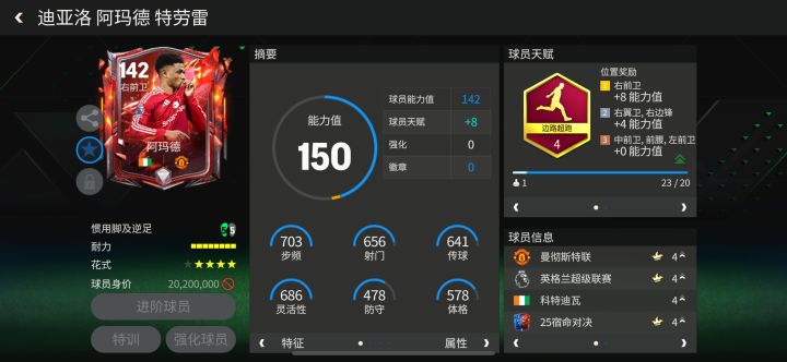 科特迪瓦:阿玛德目前效力于英超曼联的阿玛德是名震足坛的边路爆点,也是科特迪瓦的边路进攻核心。游戏中,宿命对决活动推出的阿玛德基础能力值为142,配备了边路超跑天赋。实战中,阿玛德边路速度优势明显,他的步频快,能在接球后快速完成启动,在前场,他的传中助攻能力也相当出色。盘带方面,阿玛德手感比较灵活,但他的马赛回旋花式控球稳定性较差,需要有充足的空间使用。得分方面,阿玛德内切之后的搓射弧度一般,但