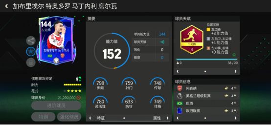 右边锋:姆贝乌莫马丁内利现年24岁,他在2019年加盟了阿森纳,并一直保持着稳定发挥,如今他是球队锋线的左路核心,他与萨卡、哲凯赖什的组合本赛季状态神勇,目前帮助阿森纳牢牢占据着英超榜首。球员卡面配置球员天赋:小火箭(冲刺速度、远射、传中、盘带、控球)花式配置:高级油炸丸子,四星花式星级耐力值:9格攻守效率:进攻高、防守高特性数量:8铁人、反越位大师、传中大师、精准射门、天赋异禀、