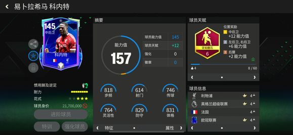 范戴克科内特现年26岁,如今他是法国国家队和利物浦的双料核心中后卫。相比于乌帕梅卡诺,他的身材更加高大,阵地防守表现更为可靠。球员卡面配置球员天赋:坚如磐石(冲刺速度、长传、人盯人、拦截、侵略性)花式配置:马赛回旋,三星花式星级耐力值:8格攻守效率:进攻中等,防守高特性数量:8铁人、铲球大师、长传大师、大力头球、聚光灯、弧线传球、铁肺、解围大师实战表现优势体现1、科内特身材高