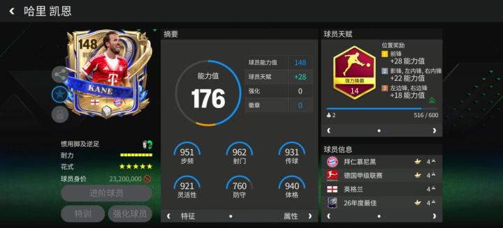 年度最佳活动现已火爆开启,F宝今天就为大家分享一下,本次活动中的年度最佳第12人球员——凯恩。凯恩在去年不仅夺得了自己的首座顶级联赛冠军,更是蝉联德甲金靴,状态非常火热。 本次活动中,凯恩推出的球员卡基础能力值达到148,是游戏中目前的主流前锋之一,接下来我们就一起看看他的游戏内表现如何。 天赋方面,凯恩配备了强力锋霸,对他的加速、射门、抢点、头球、力量五项数据提升显著,作为一名基础能力值达到