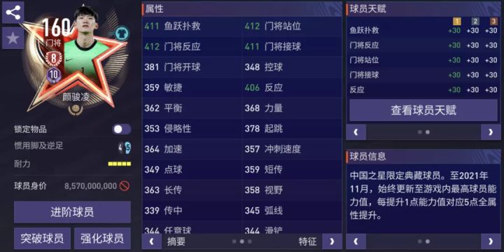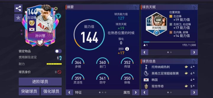 最后,孙兴慜对比贝尔最大的一个优势就是他更高的耐力值,孙兴慜的耐力值为9格,即便不配备铁肺特性他也能延续一整场的强势表现,用他作为持球点,你可以更放心的进行花式盘带。话虽这么说,但是我个人还是建议配一个铁肺,毕竟这玩意儿,有确实比没有强。