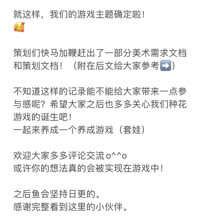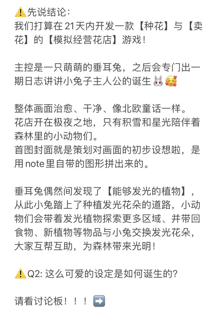 大家好我是鱼~ 我们是参加TapTap21天开发比赛的新鲜现炒队,准备做出一款治愈的北欧童话风经营花店游戏。游戏名叫《幽谷光芽》。 比赛时间过得真快啊,马上两周就要结束了。幸运的是缘分让我们遇到了配乐老师@Ruge Chang,我和老师一拍即合一见如故,沟通也很愉快! 视频里的bgm是主题曲初稿之一,很温暖、很幸福,很适合我们的主角小兔~ 核心开发期的大家压力一定都会很大,祝刷到这条的朋友们都睡个