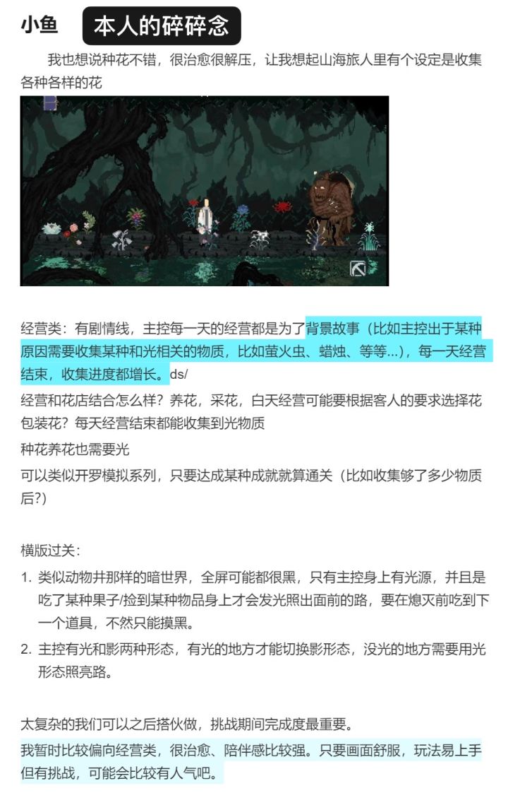 大家好我是鱼~ 我们是参加TapTap21天开发比赛的队伍之一,准备做出一款治愈的北欧童话风经营花店游戏。游戏名叫《幽谷光芽》。 今天给大家分享种花实机演示~ 以及我们好听的主题曲 三周比赛时间马上结束 但我们还会继续打磨的 希望小光芽能在充满爱的环境下诞生 然后被大家爱o^^o 晚安 #新鲜现炒 #幽谷光芽 #聚光灯gamejam开发者日志 #TapTap聚光灯独立游戏 #发现好游戏 #游戏日