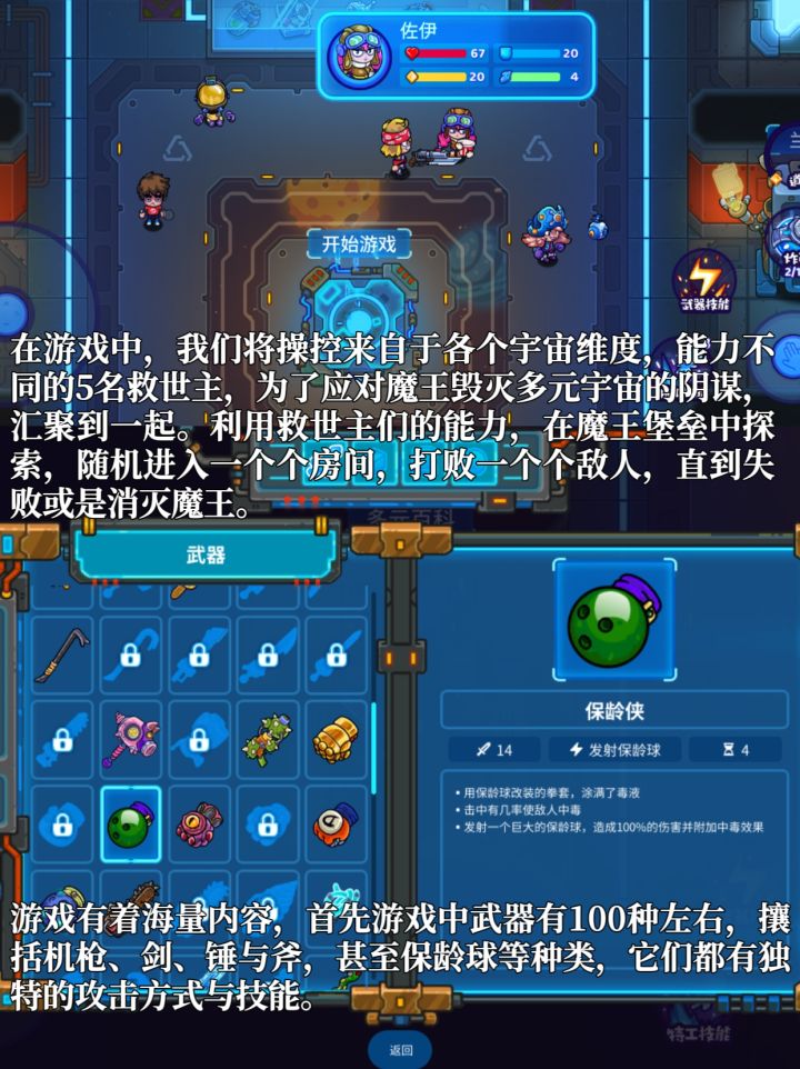 在游戏中,我们将操控来自于各个宇宙维度,能力不同的5名救世主,为了应对魔王毁灭多元宇宙的阴谋,汇聚到一起。利用救世主们的能力,在魔王堡垒中探索,随机进入一个个房间,打败一个个敌人,直到失败或是消灭魔王。