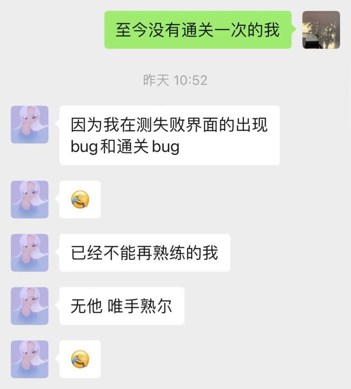 大家好,我是26号宇宙工作室的美术小a~笑哭了。已经是内部的第三轮测试了,剩最后一个游戏成功的结算画面没有画,但是我玩了不下20遍愣是一次都没有通关过,我看不到结算画面长啥样。程序小b表示她的最高记录是还能结余40秒。(我们是限时挑战游戏)至于她这么厉害的原因哈哈是因为为了测bug熟练地让人心疼小b无奈的给我截了图,并且略微