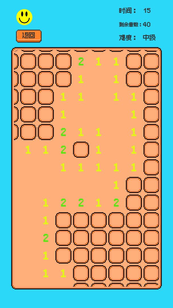 游戏使用像素风格作为游戏的美术风格,主界面包含扫雷经典模式,玩家除了可以游玩预定义的三种游戏难度,还可以在自定义场景控制行列数和雷数。主游玩场景包含重开,返回和三个显示当前模式的提示:游戏时间,难度和剩余雷数。